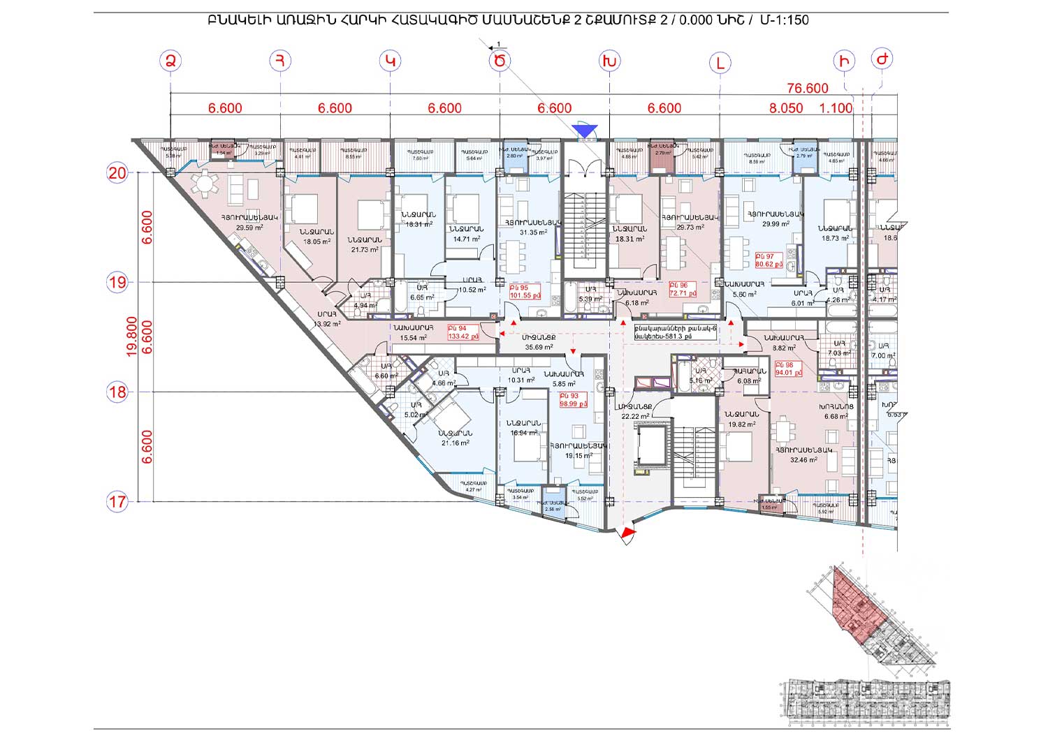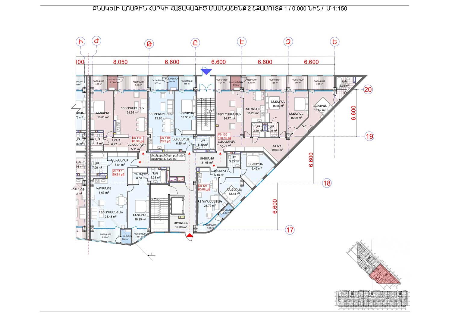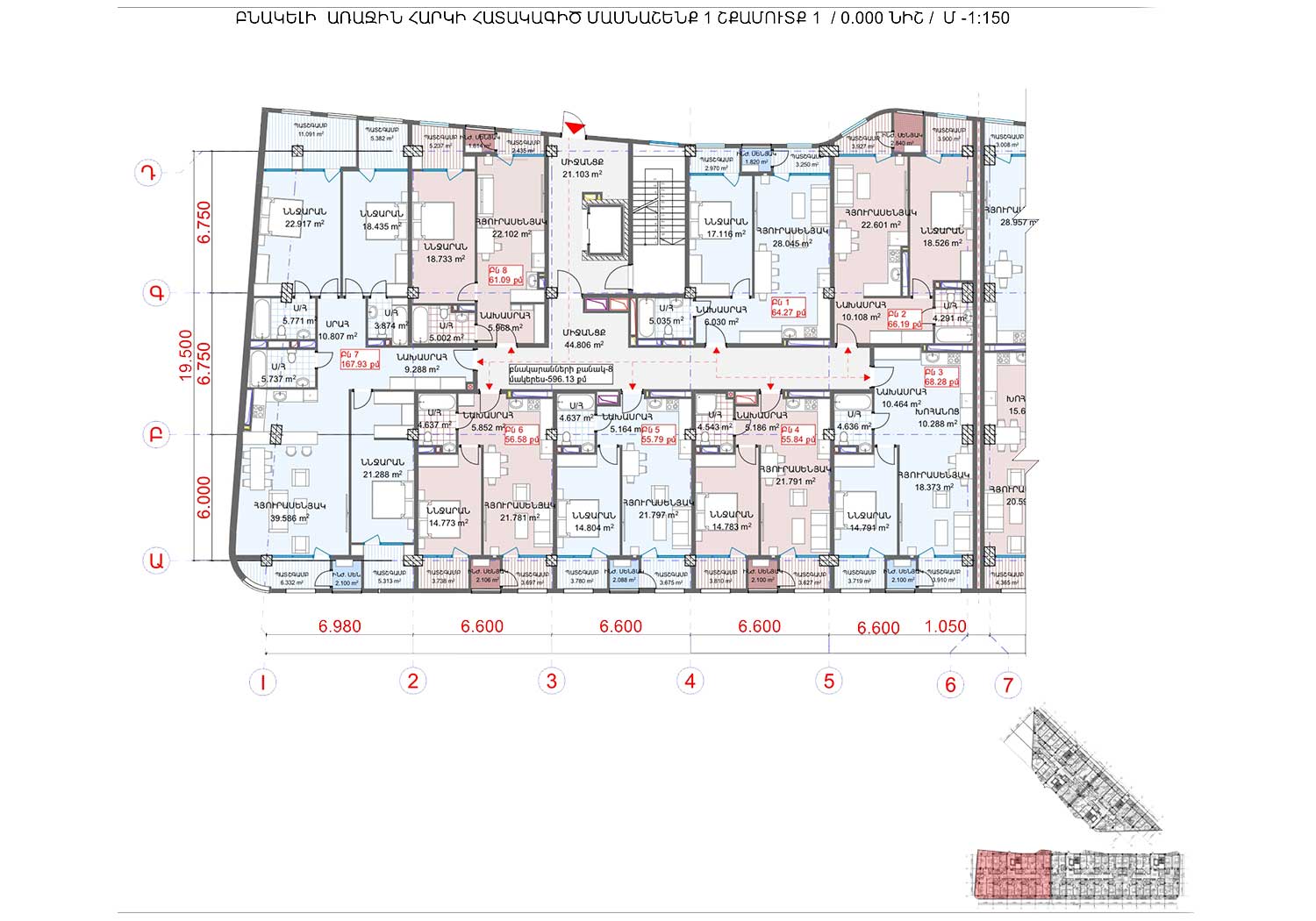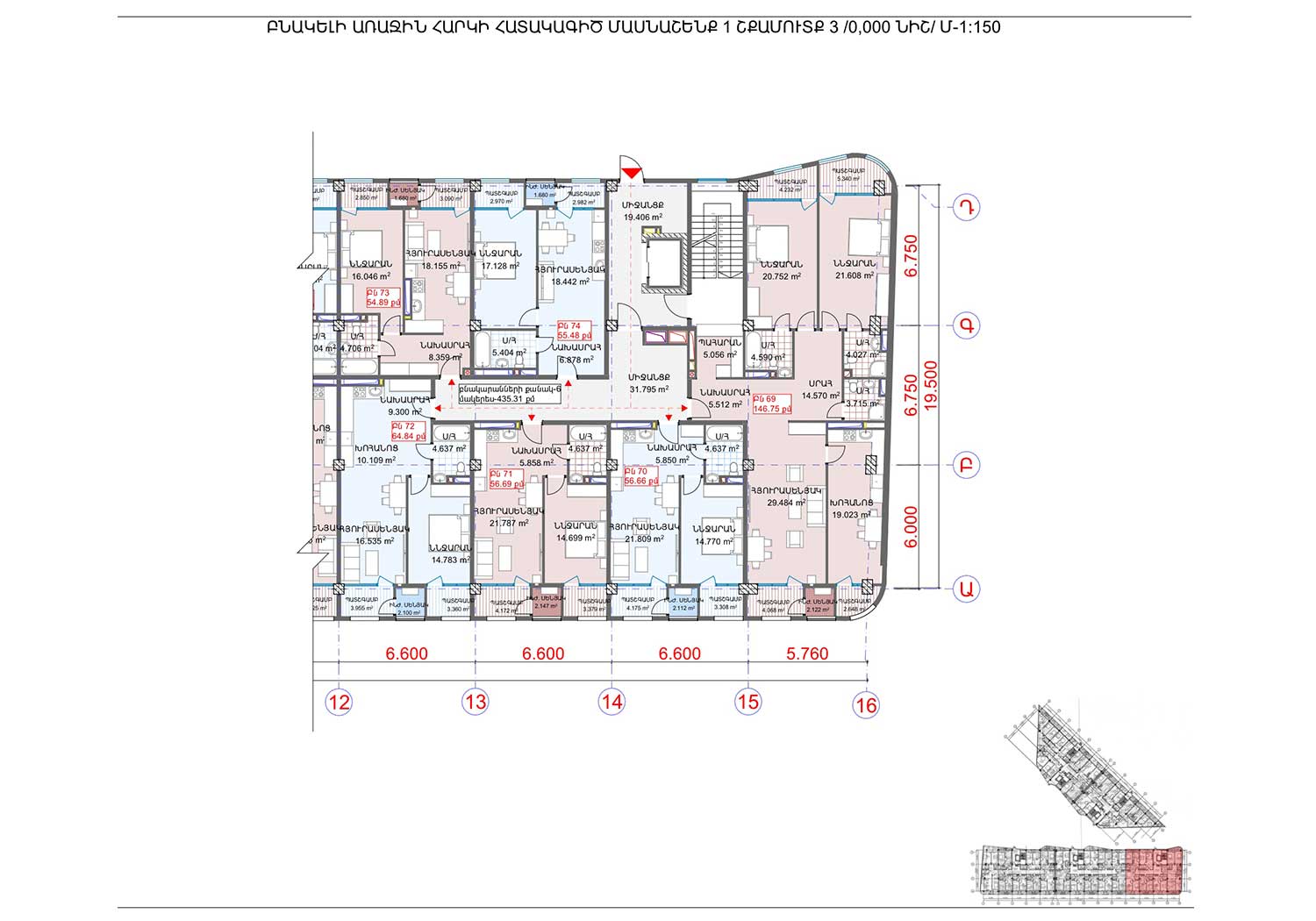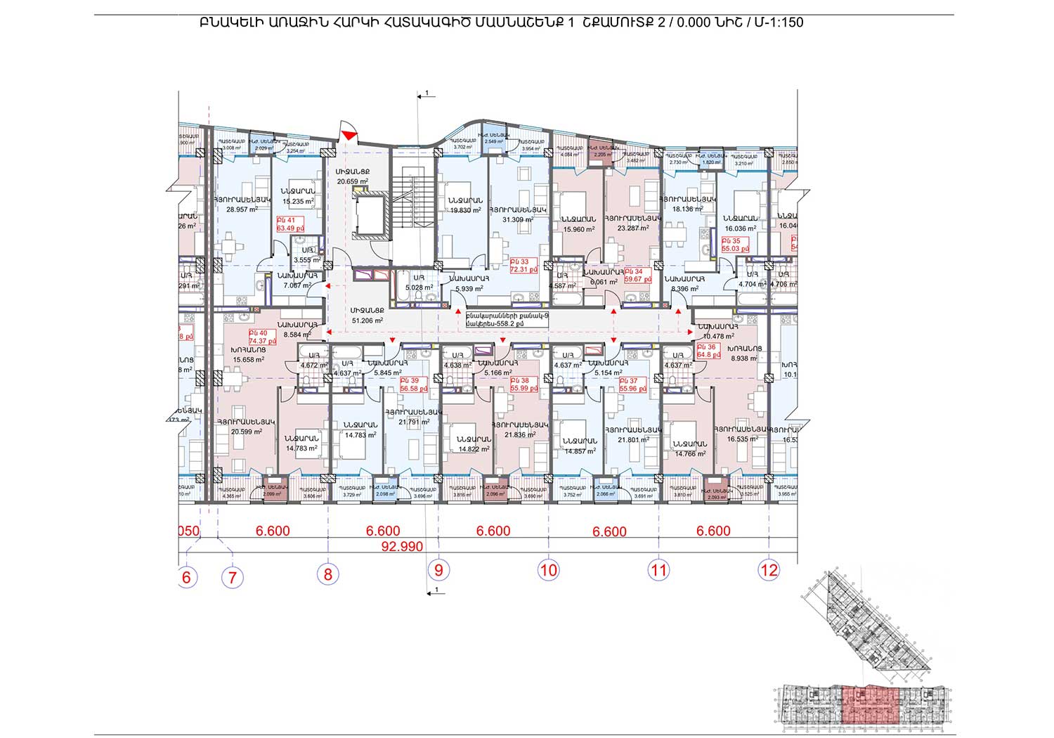 Ըստ էսքիզային նախագծի, նախատետվում է 104 բնակարան յուրաքանչյուր շենքում։ Բնակարանների ճնշող մեծամասնությունը մեկ ննջարանով և 50-60 քմ մակերեսներով են, ինչը դարձնում է ավելի մատչելի և նպատակահարմար նորաստեղծ ընտանիքների, զույգերի և միայնակ անձանց համար։ 15 և 16 հարկերում նախատեսվում են ավելի մեծ, մինչև 100 քմ մակերեսներով, բնակարաններ։